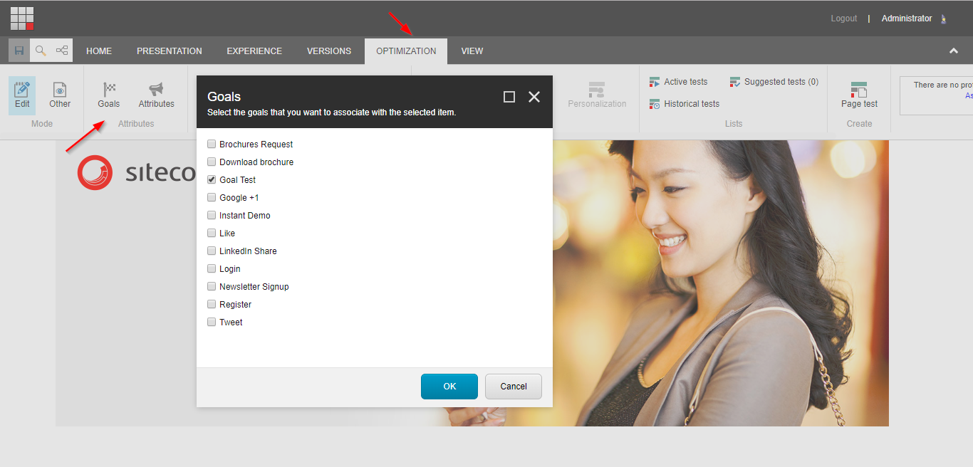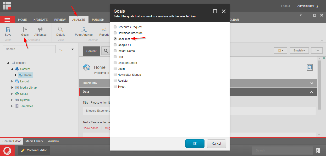The same process can be followed if you want to associate a goal with a media item. However, if you want to use the Experience Editor to associate an item, you can go to the “Optimization” tab and then click on the “Goals” menu option.