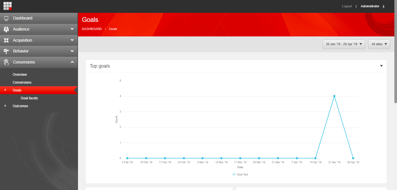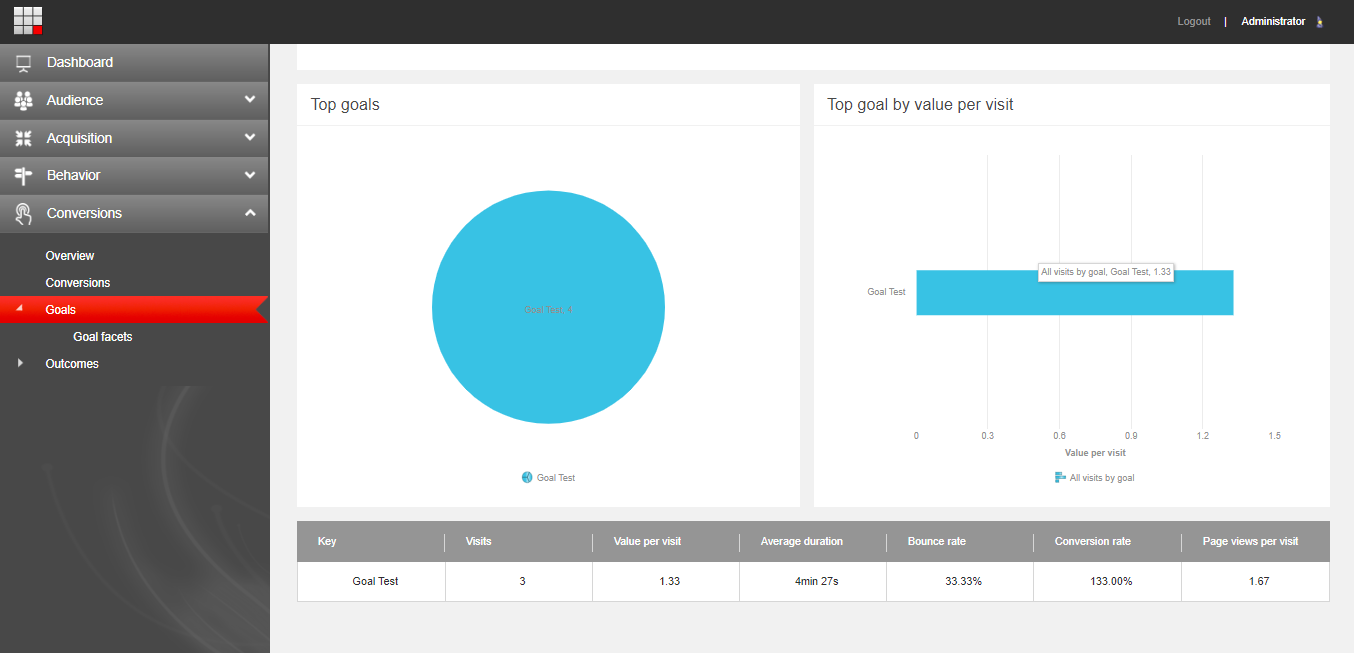 It is time to check the data after loading the page and triggering this way the goal in our case. There are two ways to see the data. One is by going to the “Experience Analytics” and then clicking on the “Goals” option of the “Conversions” menu.