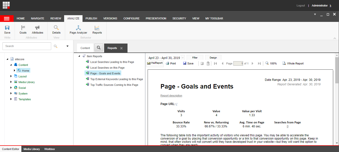 The other option is by using the item report. Select the item you associated the goal with (the homepage in my case) and then click on the “Analyze” menu to then click on “Reports”. You will be presented the different item reports you can see, this time let’s use the “Page – Goals and Events”.