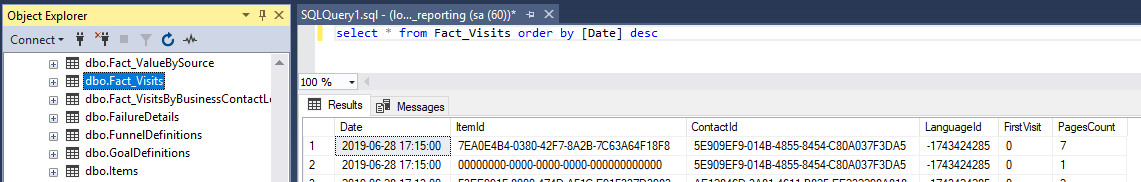 Now, let’s verify you can also see data in the “Fact_Visits” table of the reporting database. This needs to be done in the SQL server though, with any SQL client of your preference as before. I will use SQL Management Studio just for habit.