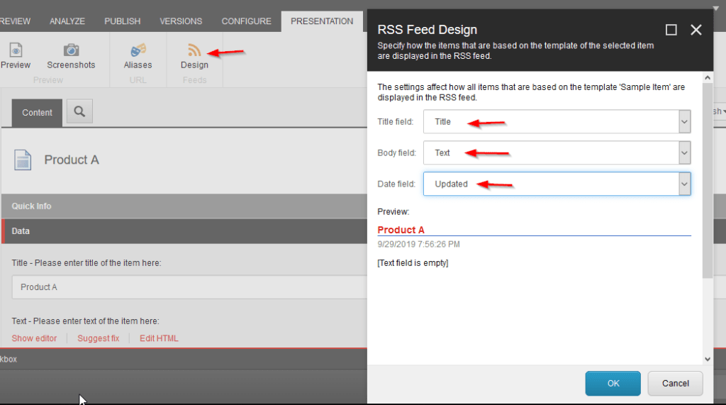 We now need to define the different fields the RSS will be displaying for title, description, etc, or in other words, will be presented in the feed. So, click on any item part of the feed and click on Presentation tab > Design.
